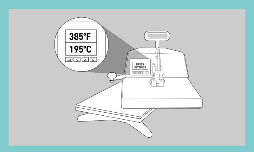 First, turn on your heat press and set the temperature to 385°F / 195°C (temperatures based on prints made with small desktop sublimation printers.) Strong pressure is recommended (settings may vary based on equipment.)